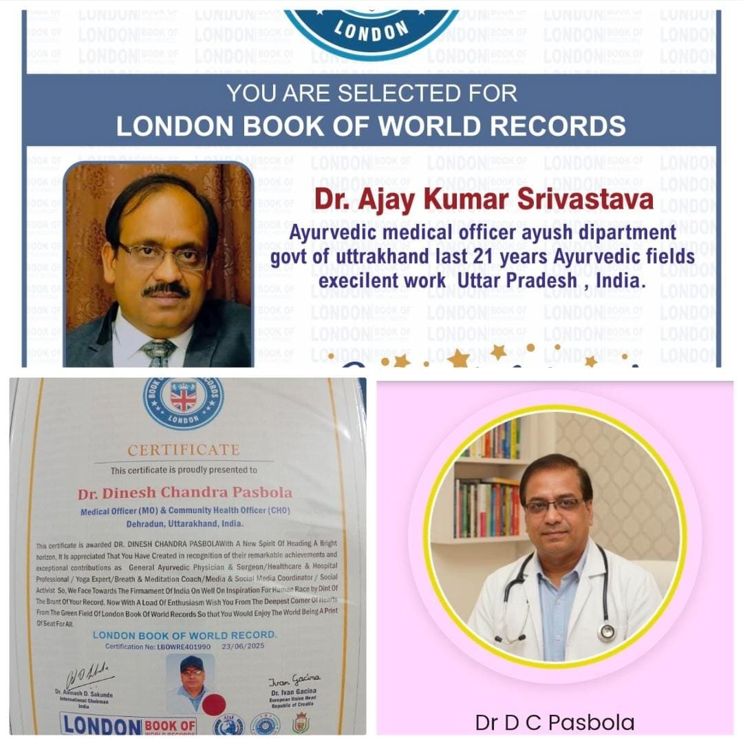 उत्तराखंड: आयुर्वेद विभाग के दो चिकित्सा अधिकारियों डॉ० प्रो० डी० सी० पसबोला और डॉ० अजय कुमार श्रीवास्तव का नाम London Book of World Records (LBWRs) में दर्ज