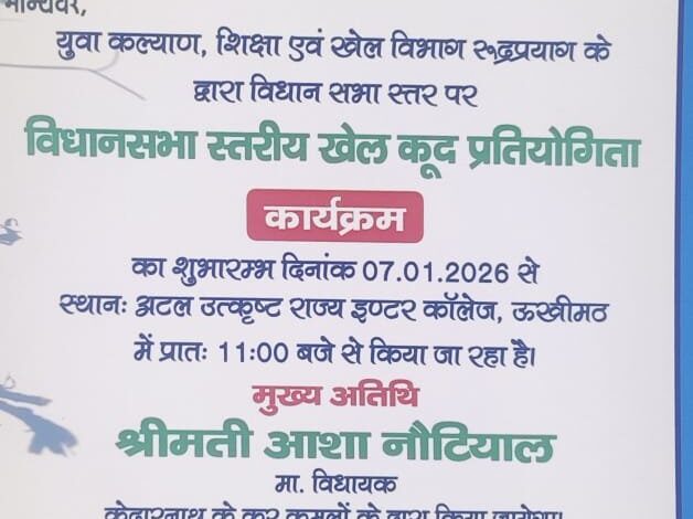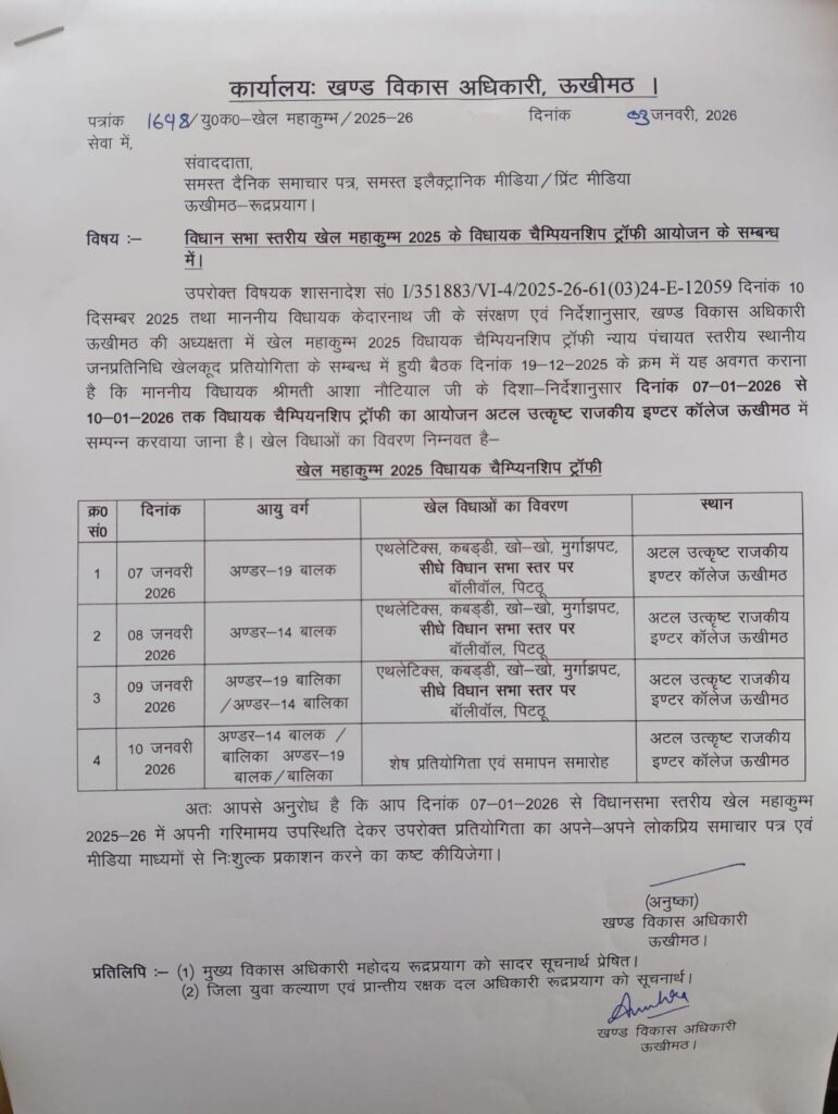 वहीं खण्ड विकास अधिकारी ऊखीमठ अनुष्का ने बताया कि विधानसभा स्तरीय खेल महाकुंभ 2025 के विधायक चैम्पियनशिप ट्राफी का शुभारंभ 7 जनवरी 2026 से अटल उत्कृष्ट राजकीय इण्टर कालेज ऊखीमठ के मैदान किया जाएगा।